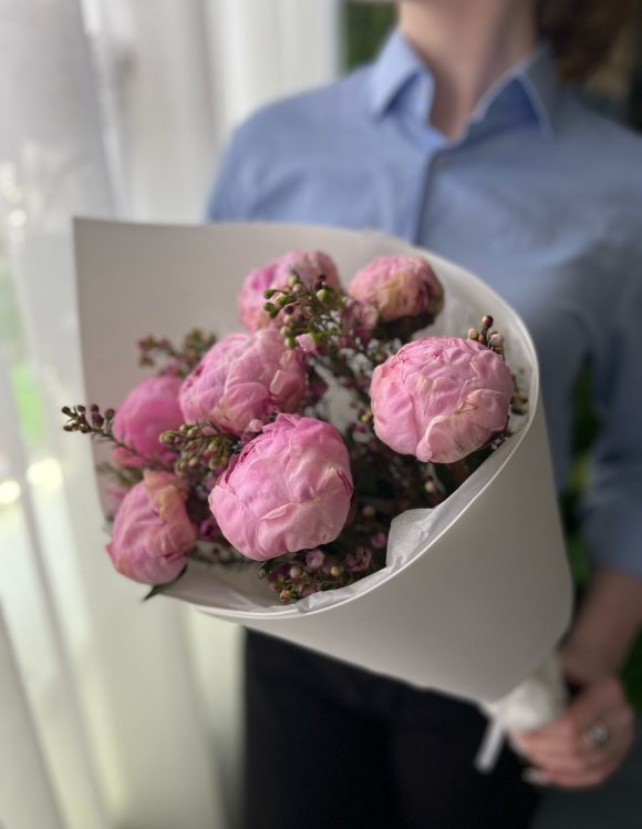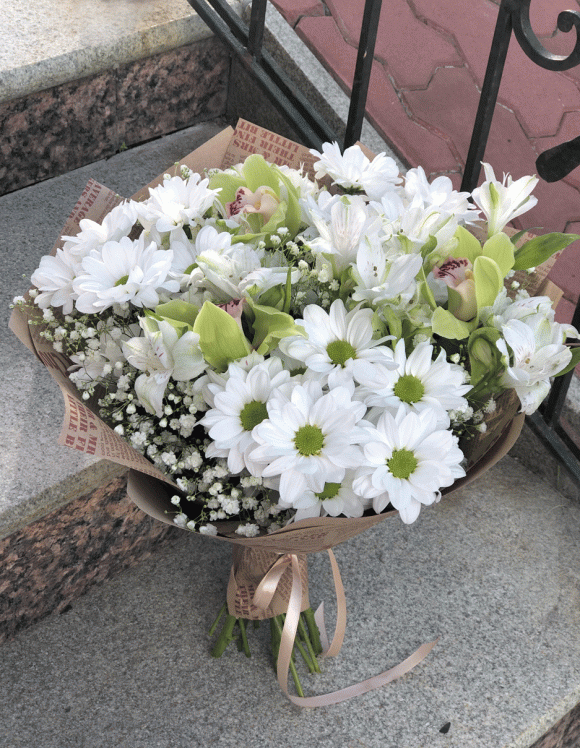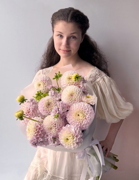 Внимание! Георгины цветы сезонные, букет актуален в августе и сентябре. О наличии спрашивайте у флориста.