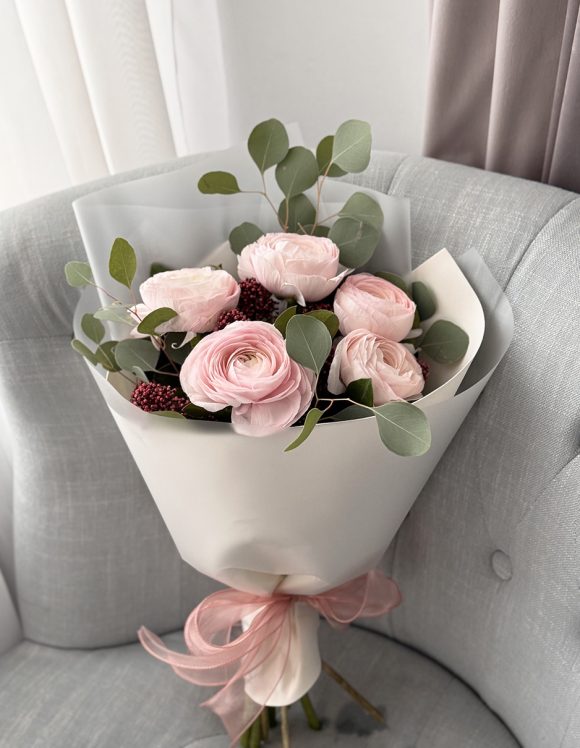 Внимание! Ранунукулюсы цветы сезонные, букет актуален с декабря до апрель месяцы. Состав букета: Ранукулюсы 5 шт Скиммия Эвкалипт Бумага, ленты