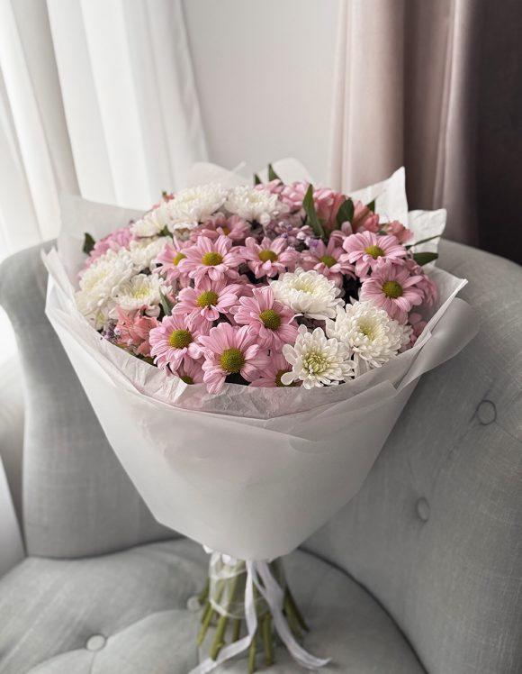 Состав букета: Хризантемы белые 5 шт Хризантема розовая 5 шт Альстромерии 5 шт Гипсофила 2 шт