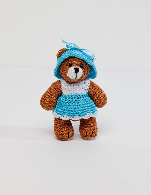 Мягкая игрушка Мишка ручной работы умещается на ладони. Все детали одежды снимаются, а платье даже застегивается на малюсенькие пуговки.Очень аккуратная работа мастера. Мишка связан с любовью, из душевного тепла Х/Б ниток, внутри антидепрессантный наполнитель, лапки собраны на шплинтах. Дарите на радость!