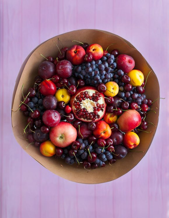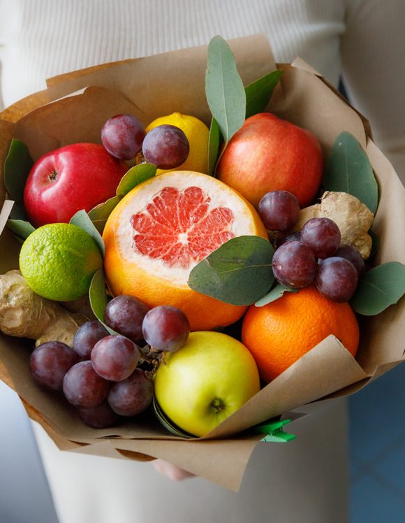 Фруктовые букеты радуют своим разнообразием. Можно заказать композиции с апельсинами и гранатами, яблоками и грушами, сливами, клубникой, сухофруктами и пр. А если дополнить букет свежими цветами, взрыв положительных эмоций будет гарантирован.