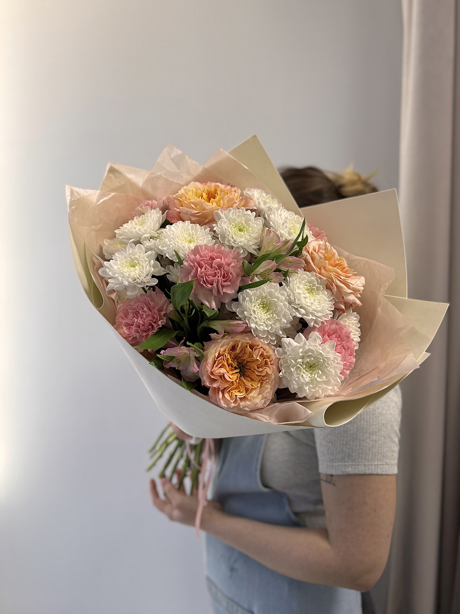 Букет из кремовых роз и хризантем
